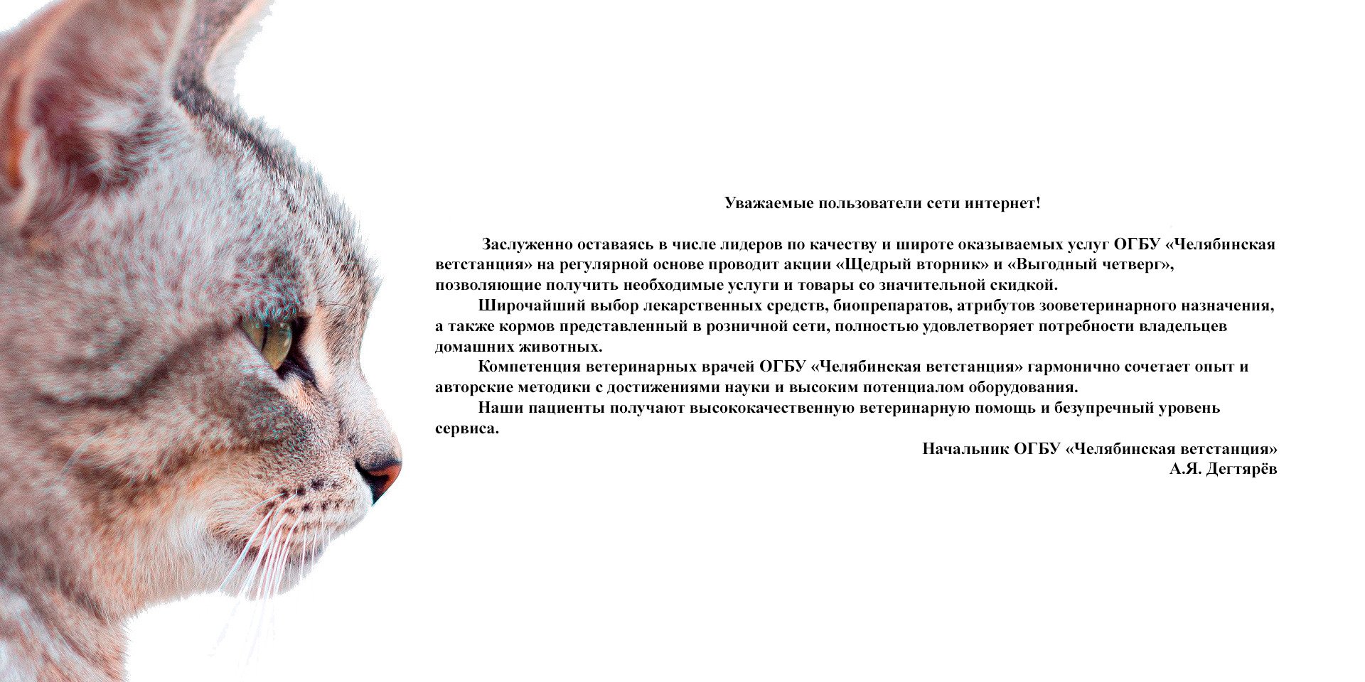 Оставаясь в числе лидеров по качеству и безопасности оказываемых ветеринарных услуг ОГБУ «Челябинская ветстанция» на регулярной основе проводит акции «Щедрый вторник» и «Выгодный четверг», позволяющие получить необходимые услуги и товары со значительной скидкой.