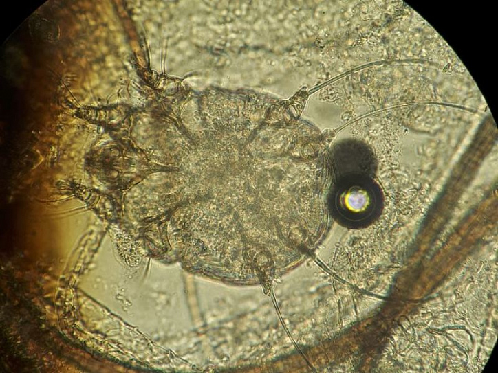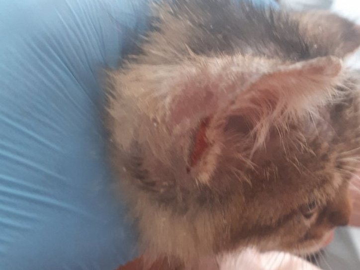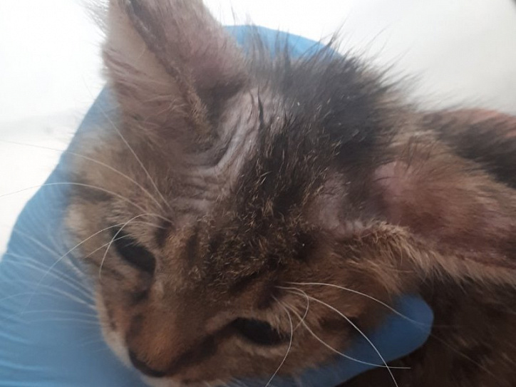 В начале августа к нам в филиал на Свердловском, 18а обратилась молодая пара с маленьким котёнком. При визуальном осмотре стало понятно, что у животного проблемы с шёрстным покровом. На приёме у врача Екатерина (хозяйка котёнка) рассказала, что котика они взяли с рук два дня назад у соседки по саду. Несмотря на поражения у котёнка, которые уже были, молодых людей этот факт не остановил, тем более им сказали, что это не заразно, а так проявляется аллергия на корм. В результате осмотра наблюдались очаги поражения на голове, вблизи ушей. Постоянно почёсывая поражённые места, котик разносил паразитов по всему телу. Вскоре шёрстка начала выпадать, особенно это хорошо было заметно на голове. На голых участках видны коросты. Ко всему прочему, у котика были обнаружены блохи. На приеме животного врачом были взяты анализы крови, соскобы на дерматофитоз (грибковое заболевание) и арахноэнтомоз (паразитарное). При микроскопическом исследовании соскобов с кожи был обнаружен возбудитель паразитарного заболевания – подкожный чесоточный клещ Sarcoptes scabiei, а также споры грибков в и поставлен диагноз – саркоптоз, дерматофитоз, блошиный дерматит.